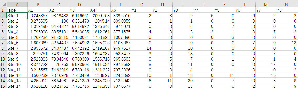 某生态研究团队调查了30个不同地点的植被群落和环境因子,希望通过RDA分析了解环境因子如何影响植物群落的分布格局。数据包括5个环境变量(X1-X5)和8个植物物种(Y1-Y8),部分数据如下。