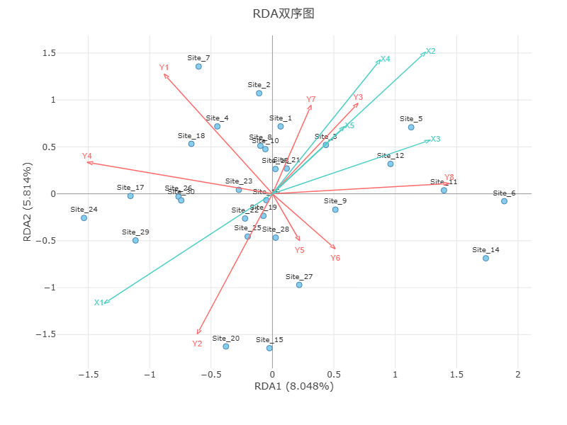 | 4 | RDA双序图 | 可视化展示样点、响应变量和解释变量的关系 |