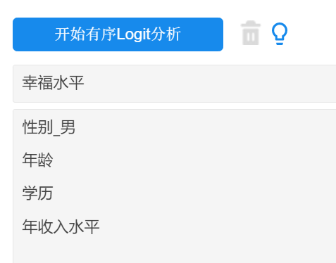 本例子中研究X对于Y的差异;X分别为性别,年龄,学历和年收入水平,Y为幸福水平,幸福水平共由三项表示,分别是“不幸福,比较幸福和十分幸福”。由于性别为类别数据,所以将其设置为虚拟哑变量,并且以“男”作为参照项,因为放入“女”到模型中,放置如下: