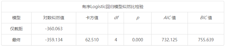 第3个表格展示模型的似然比检验结果,其原假设是模型的回归系数全部均为0,因此如果p 值小于0.05,则说明拒绝原假设,即说明模型有效;反之如果p 值大于0.05则说明接受原假设,即说明模型回归系数全部均应该为0,模型无意义。同时上表格还列出赤池信息准则AIC和BIC 值,如果进行过多次模型分析(比如模型的自变量个数变化时),然后需要对比模型的优劣,则可通过此两个指标进行分析,此两个指标值越小越好,没有固定范围标准。