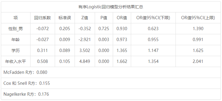 在模型通过平行性检验后,接着对模型整体有效性进行分析(模型似然比检验),从上表可知:此处模型检验的原定假设为:是否放入自变量(性别, 年龄, 学历, 年收入水平)两种情况时模型质量均一样;分析显示拒绝原假设(χ2=62.510,p =0.000< 0.05),即说明本次构建模型时,放入的自变量具有有效性,本次模型构建有意义。