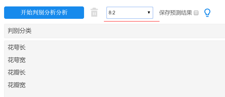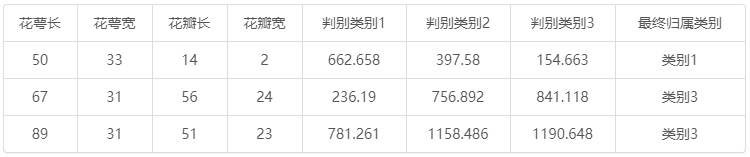 | 花萼长 | 花萼宽 | 花瓣长 | 花瓣宽 | 判别类别1 | 判别类别2 | 判别类别3 | 最终归属类别 |