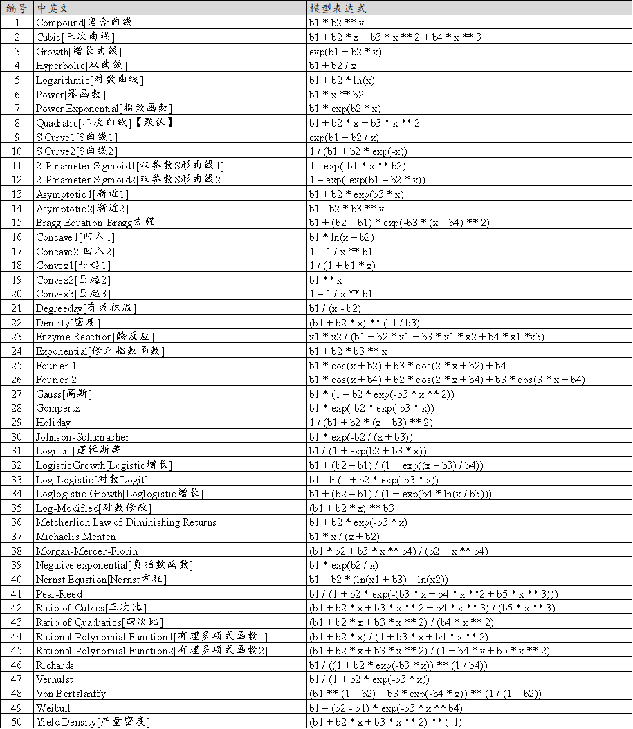 诸如此类非线性关系(即不是直接关系)的非线性模型,可使用非线性回归进行研究。SPSSzero当前提供约50类非线性函数表达式,涵盖绝大多数非线性函数表达式。如下图:
