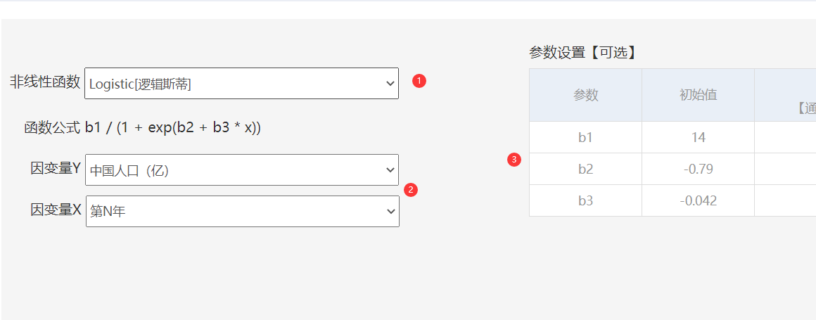 Logistic模型函数表达式为:y = b1 / (1 + exp(b2 + b3 * x)),其中y为人口数量,x为‘第N年’(起始1978年为数字0,1979为数字1,依次下去),b1,b2和b3分别为三个估计参数,exp为自然指数的意思。其中b1的实际意义为渐近线,即Y(人口)无限接近的数字。