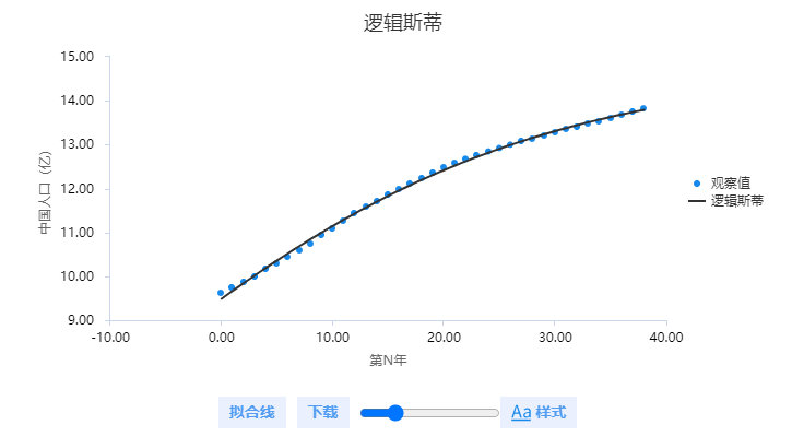上表格展示出模型拟合情况,通常可查看R 方来判断模型拟合效果,本案例时R 方值接近于1,意味着本次的logistic模型非常有效的拟合了我国人口增长数据(1978~2016),至于F 检验,在非线性回归模型时使用较少,通常不使用此指标。接着使用拟合图直观展示拟合效果如下图: