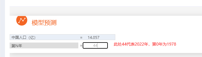 上图直观展示本次人口增长logistic模型拟合效果情况。从图中也可看出,实际数据与拟合数据基本完全吻合在一起,说明拟合效果非常好。因而当前模型可使用,因此用于预测2022年的数据,自变量x为第N年,2022年为第44年,因此输入数字44,得到2022年的人口数据为14.057亿。