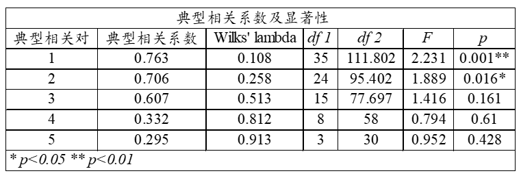 此表格展示出典型变量的提取情况,上表中共显示有5个典型变量被提取出来,在进行F 检验时显示,其中仅2个典型变量是呈现出0.01水平的显著性,因此,最终应该以两个典型变量为准进行后续研究。并且第一个典型变量的相关系数值为0.763,第二个典型变量为0.706,相关系数值较高,说明典型变量之间有着紧密的正向相关关系。此步骤非常重要,共提取出2个典型变量,并且直接得出典型变量对的相关关系情况(即X组和Y组之间的相关关系情况)。