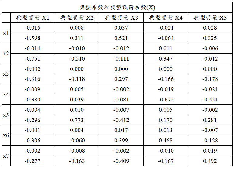 上表格共展示出两项信息,分别是典型变量与X组7项指标的数学表达式(典型系数),以及典型变量与X组7项指标之间的相关关系(典型载荷系数);