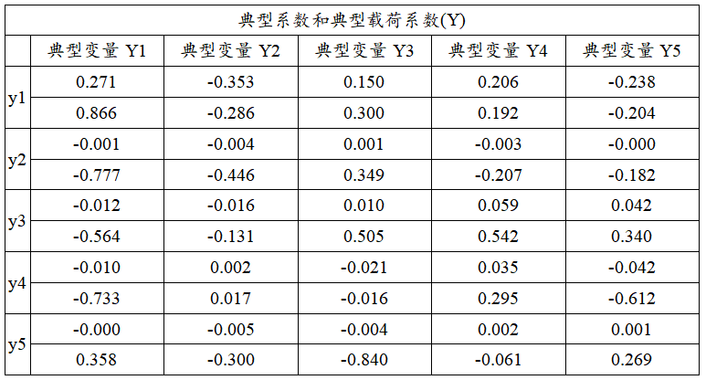 上表格共展示出两项信息,分别是典型变量与Y组5项指标的数学表达式(典型系数),以及典型变量与Y组5项指标之间的相关关系(典型载荷系数);