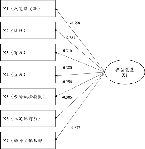 上图非常直接的展示出第1个典型变量与7个指标之间的相关关系情况,明显的,典型变量与X1(反向横向跳),X2(纵跳)的关系很强,即典型变量更多地提取X1(反向横向跳),X2(纵跳)这两项的信息。