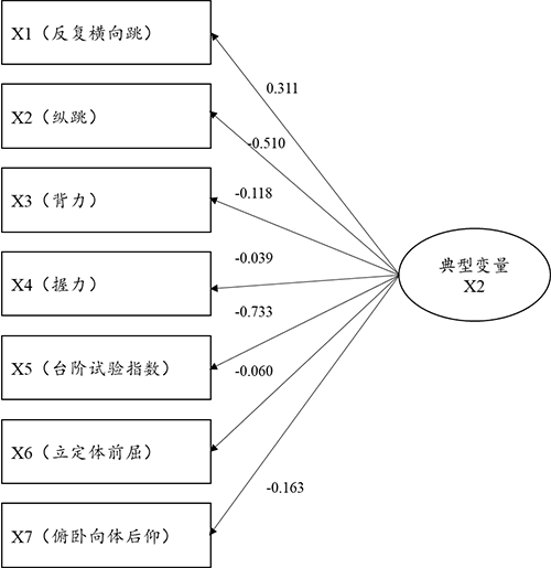 完成上述分析后,已经得出结论即:X组与Y组进行典型相关分析时,总共提取出两个典型变量对,典型变量对1更多地提取X1(反向横向跳),X2(纵跳)这两项的信息;典型变量对2更多地提取X2(纵跳),X5(台阶试验指数)这两项的信息;典型变量对1更多地提取Y1(50米跑时间),Y2(跳远),Y3(投球),Y4(引体向上)这4项的信息;典型变量对2更多地提取Y2(跳远)的信息。除此之外,典型变量对1之间的相关系数值为0.763,并且典型变量对2之间的相关系数值为0.703,典型变量相关系数值均高于0.7,意味着X组7项指标与Y组5项指标之间有着非常紧密的正向相关关系。