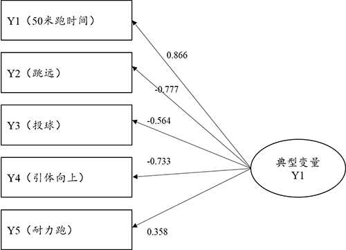 上图非常直接的展示出第1个典型变量与5个指标之间的相关关系情况,明显的,典型变量与Y1(50米跑时间),Y2(跳远),Y3(投球),Y4(引体向上)的关系很强,载荷系数绝对值均大于0.5,即典型变量更多地提取Y1(50米跑时间),Y2(跳远),Y3(投球),Y4(引体向上)这4项的信息。