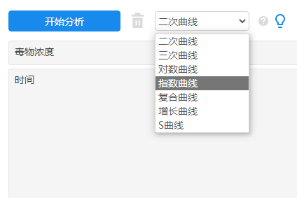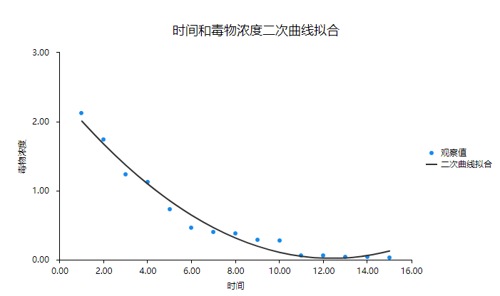 曲线拟合图直观展示出数据间的拟合关系,上图可以明显的看出,时间和毒物浓度之间确实呈现出指数拟合关系。因而也说明数据基本呈现出指数拟合。