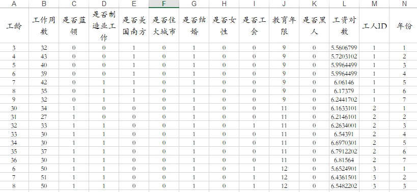 当前有一份595名美国工人1976-1982年关于工资的面板数据(N=595,T=7),涉及数据包括被解释变量:工资对数;另外包括11个解释变量,分别为:工龄,工作周数,是否蓝领,是否制造业工作,是否美国南方,是否住大城市,是否结婚,是否女性,是否工会,教育年限,是否黑人等。部分数据如下: