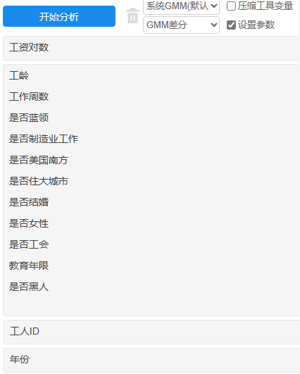 • 工具变量设置上,默认是滞后1阶到全部阶数,这样工具变量个数会很多,建议可选择压缩工具变量个数等参数,也或者结合自身专业知识设置滞后阶数。