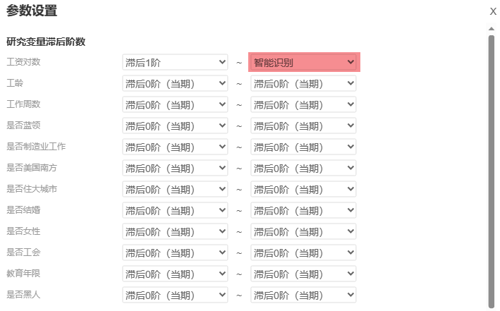 • 被解释变量滞后阶数设置上,建议选择‘智能识别’,让系统自动运行不同的滞后阶数对比选择最优模型;