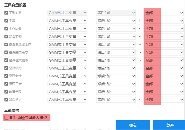 最后下图中‘时间项哑变量放入模型’,其是指将时间项处理成哑变量并且纳入模型中,默认不选中该项,如果需要可选中即可。