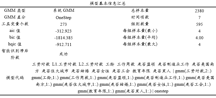 上表格展示模型信息,包括GMM类型,OneStep或TwoStep差分,信息准则aic值、bic值、hqic值等。并且展示模型代码,模型代码中L表示滞后阶数,比如L1表示之后1阶。Gmm表示gmm式工具变量,括号里面‘1:.’表示滞后1阶到全部阶数,如果是IV式工具变量则格式为iv(分析项),如果有压缩工具变量则会有‘collapse’参数值。上表格中展示 工具变量个数,总样本量,时间项,组别数量等信息,其受到工具变量等滞后阶数,是否压缩工具变量等参数影响,其并不特别意义。