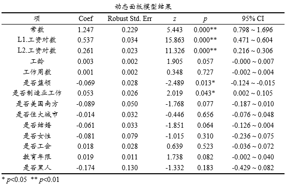上表格展示动态面板模型结果,与普通的回归解释保持一致,先查阅某项是否呈现出显著性,如果呈现出显著性则再查阅回归系数Coef值,大于0则为正向影响,小于0则为负向影响。另外本次案例时被解释变量的滞后1阶和滞后2阶被纳入模型中,该两项均呈现出显著性。与此同时,是否蓝领和是否制造业工作这两项均呈现出显著性,是否蓝领的回归系数为-0.069<0,意味着蓝领的工作相对较低,并且是否制造业工作这项的回归系数值是0.053>0,说明制造业工作的工人其工作相对更高。