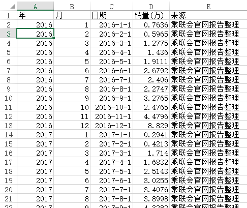 当前有2016.1 ~ 2022.11共计83个月度的新能源汽车销售数据,数据来源于乘联会官网报告整理。众所周期,从2015年起新能源汽车销售具有逐年增长趋势,并且每年均有季节性周期波动,比如年前通常是高峰期,但年后是低谷期。直观上看,当前数据非常适合进行Sarima模型构建,部分数据如下: