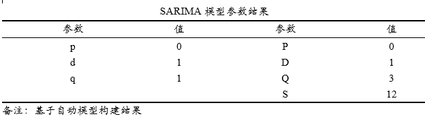 | SARIMA模型参数结果 | 展示p/d/q/P/D/Q等参数值 |