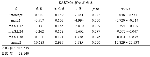 | SARIMA模型参数表 | 展示模型具体拟合参数值,意义较小,但其中的AIC和BIC值意义较大 |
