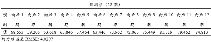 Sarima构建后一般要求模型残差为白噪声,可通过Q统计量检验进行白噪声检验(原假设:残差是白噪声);比如Q6用于检验残差前6阶自相关系数是否满足白噪声,通常其对应p 值大于0.1则说明满足白噪声检验(反之则说明不是白噪声),常见情况下可直接针对Q6进行分析即可;从Q统计量结果看,Q6的p 值为0.5大于0.1,则在0.1的显著性水平下不能拒绝原假设,模型的残差是白噪声,模型基本满足要求。