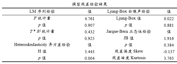 Ljung-Box白噪声检验用于检验模型残差是否满足白噪声,其原假设H0为序列为白噪声,备选假设H1为序列非白噪声;Heteroskedasticity异方差检验用于检验模型残差是否存在异方差,其原假设H0为序列不存在异方差,备选假设H1为序列存在异方差;Jarque-Bera正态性检验用于检验模型残差是否满足正态性,其原假设H0为序列满足正态性,备选假设H1为序列非正态性;