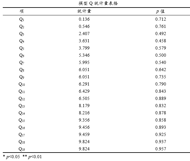 | 模型Q统计量表格 | 展示残差Q检验结果,检验模型残差白噪声情况 |