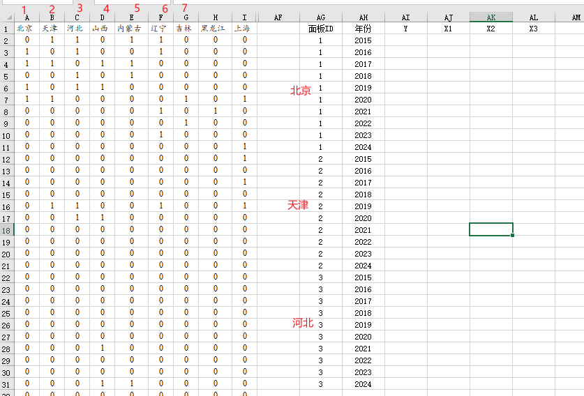 比如31省市10年的数据,空间权重矩阵为3131阶,但是面板数据是3110=310行,那么二者如何去对应呢,比如空间权重矩阵里面的四川与面板数据里面的四川。SPSSzero 在进行匹配时,是严格按照ID的数字大小先后顺序原则进行,即权重矩阵里面的顺序比如为:北京->天津->河北->山西…这样的顺序,那么面板数据里面的ID编号数字也要依从这样的顺序,建议研究者首先需要确保树重矩阵里面的空间点顺序,一定和面板数据里面空间点的数字大小顺序保持一致,比如下图: