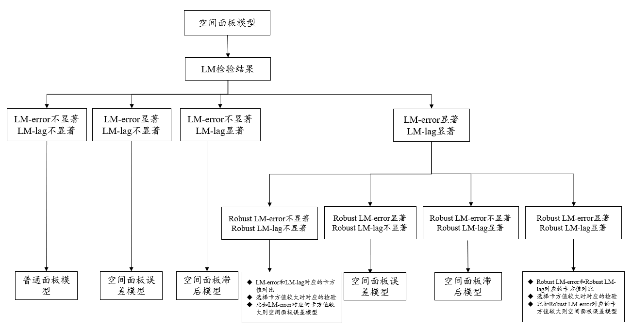 当前默认输出LM检验,按照LM检验流程直接选择空间面板滞后模型或者空间面板误差模型,当然还有可能直接使用普通的面板模型进行分析即可,关于LM检验的判断逻辑如下图所示: