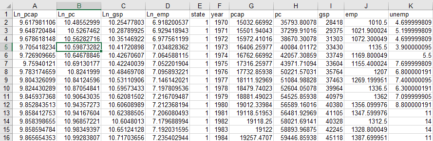 当前有一份空间面板数据,其为美国1970~1974共5年48个州的面板数据,包括以下变量分别是gsp(州产出),pcap(公共资本),pc(民营资本),emp(就业量),现在希望研究州公共资本、民营资本和就业量对于州产出的影响作用关系,并且考虑空间作用。由于州产出gsp,公共资本pcap、民营资本pc和就业量emp这几个变量数字较大,因而对该4项分别取对数操作,最终部分数据如下图所示: