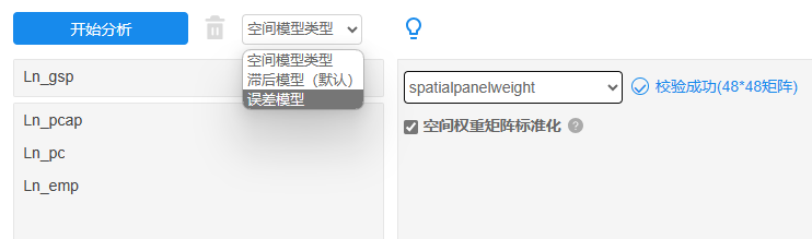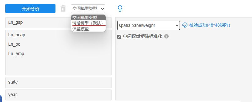 将因变量和自变量放入对应框中,并且放好state和year(即面板数据的id和year两项),另空间模型类型上默认是滞后模型,具体应该空间面板滞后模型还是空间面板误差模型,建议以输出的LM检验进行判断和选择。另外下拉选择‘空间权重矩阵’文档即spatialpanelweight这份数据,默认对空间权重矩阵行标准化处理,需要注意的是,空间权重矩阵通常需要进行行标准化处理。