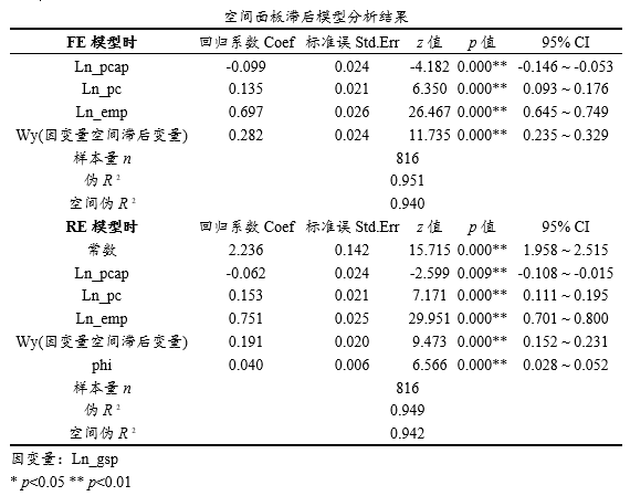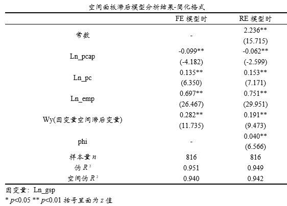 | 空间面板滞后模型分析结果 | 输出模型的分析结果,包括回归系数和显著性检验结果等,并且包括面板固定效应和面板随机效应两个模型结果 |