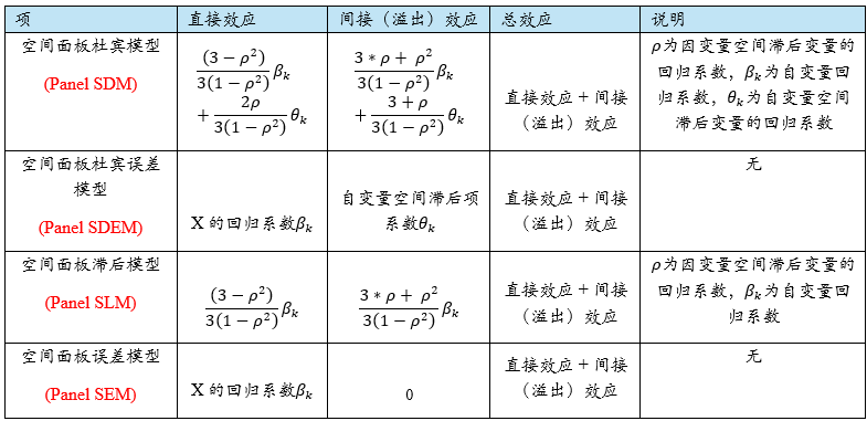 - 空间面板模型时,其空间滞后效应计算公式如下图,在SPSSzero 中,空间面板共包括下述四类模型,分别是‘空间面板杜宾模型’、‘空间面板杜宾误差模型’、‘空间面板滞后模型’和‘空间面板误差模型’,并且SPSSzero 中分别区分固定效应和随机效应,但不论是固定效应还是随机效应,其计算公式保持一致,最终计算公式如下: