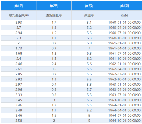 当前有一项美国宏观联邦基金利率、通货膨胀率和失业率的数据,数据日期从1960年第1季度到2012年第1季度,单位为季度,共计209个数据。现针对该3个宏观计量研究进行研究时发现该3项满足同阶单整(1阶单整)(可参考SPSSzero 中VAR模型或coint协整的手册),并且通过协整检验,本案例使用误差修正模型ECM研究短期波动情况。(数据序列满足1阶差分平稳,因此误差修正模型ECM时也使用1阶差分后数据)。部分原始数据如下图所示: