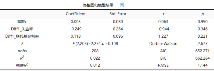 协整回归模型研究长期均衡关系,从上表可以看到:协整方程模型公式为:通货膨胀率=0.005-0.249失业率 + 0.118联邦基金利率。长期均衡关系的检验上看,失业率的系数值为-0.249,并没有呈现出显著性(t =-0.944,p =0.346>0.05),意味着失业率不会对通货膨胀率产生长期影响关系。