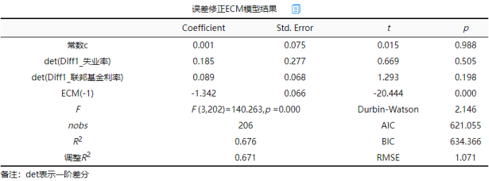 如果上期误差值ECM(-1)系数即修正系数呈现出显著性,则说明短期波动偏离长期均衡即非均衡状态时,上期误差ECM(-1)会将该非均衡状态拉回到均衡状态水平(即对非均衡状态进行调整),反之则说明上期误差对非均衡状态的调整幅度不大。