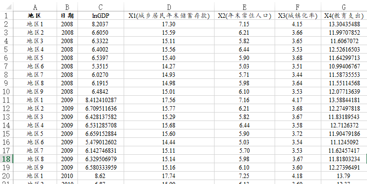 当前有一份城镇GDP相关的数据,共有9个地区分别11年(2008~2018)的数据,无缺失数据因而为9*11=99个样本。数据中包括X1(城乡居民年末储蓄存款), X2(年末常住人口), X3(城镇化率), X4(教育支出)共4个自变量,因变量为GDP。现希望研究4个自变量对于GDP的影响情况。以及数据值较大,为防止异方差问题因而进行过取对数处理。