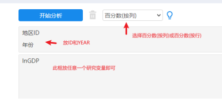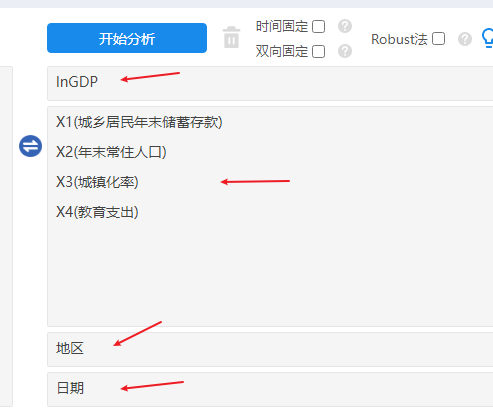 研究4个X对于GDP的影响,并且需要标识出面板数据,分别将地区和日期放入对应的‘个体ID’和‘时间’框中。