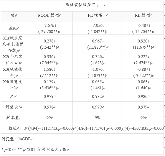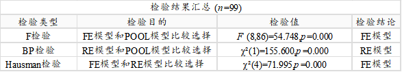 | BP检验 | RE模型和POOL模型比较选择 | p 值<0.05 | RE模型 |
