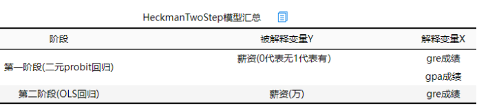 上表格展示Heckman两阶段模型基本情况,包括第1阶段和第2阶段时,分别对应的被解释变量和解释变量情况。