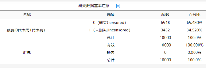 上表格展示Heckman两阶段模型研究数据基本情况,针对第1阶段的被解释变量薪资中有6548个删失数据(即数字为0的个数),3452个未删失(即数字为1的个数)。以及数据中没有其它缺失数据。