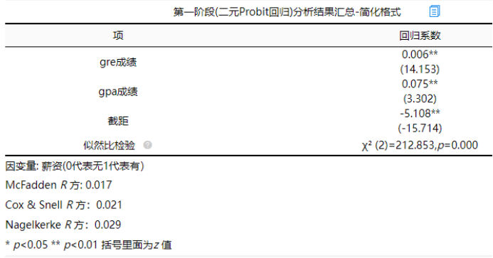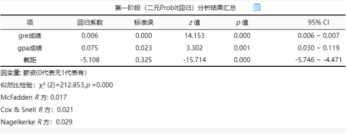 上表格展示出Heckman第1阶段二元probit回归的简化结果表格,该表格列出模型的关键信息点,可直接使用。