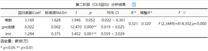 上表格展示第1阶段二元probit回归的结果,包括模型的R方值,似然比检验,各解释变量的显著性情况等,事实上第1阶段二元probit回归结果的意义较小(多数时候并不关注R方,似然比检验,显著性等指标),因为第1阶段二元probit回归目的在于计算得到IMR值,纳入第2阶段OLS回归中。上表格中gre成绩和gpa成绩均呈现出0.01水平显著性,意味着该两项确实会影响到‘是否有薪资数据缺失’。