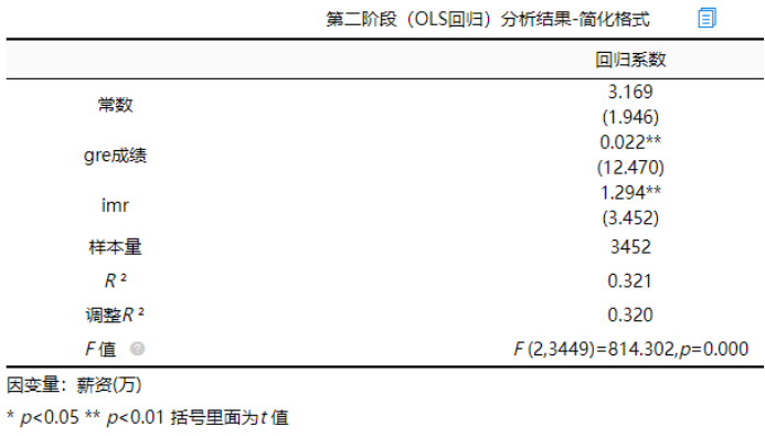 上表格展示出Heckman第2阶段ols回归的简化结果表格,该表格列出模型的关键信息点,可直接使用。