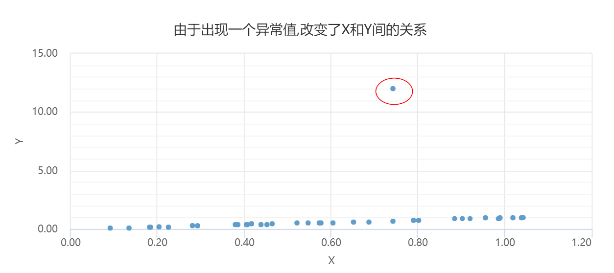 上图展示X和Y的散点关系,可能明显的看出,X和Y之间有着非常紧密的关系,X增大,Y也增大。上图中也没有异常数据;但如果数据中出现一个异常值,则很可能扭曲数据间的关系,如下图所示: