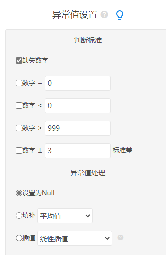 上述已经说明异常值会带来严重的影响,扭曲数据结论等。那么首先需要设定异常值的标准,然后再对其进行处理。异常值的判定标准并不统一,更多是通过人为标准进行设定,SPSSzero 提供以下几类判定规则:
