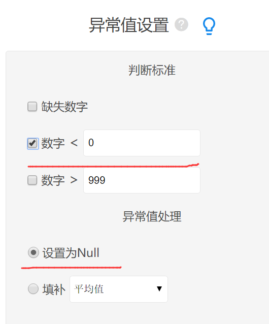 • 如果填充为平均数,中位数或众数这三种情况时;如果不满足判断标准外(即正常数据)的个数小于3个,则整个处理不生效(无法填充);