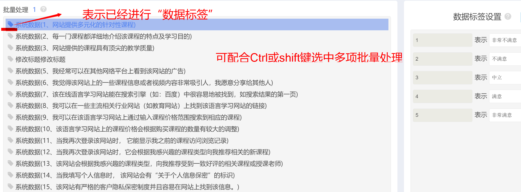 • 用户可通过Ctrl或者Shift键同时选中多个标题;进行批量化标签处理。